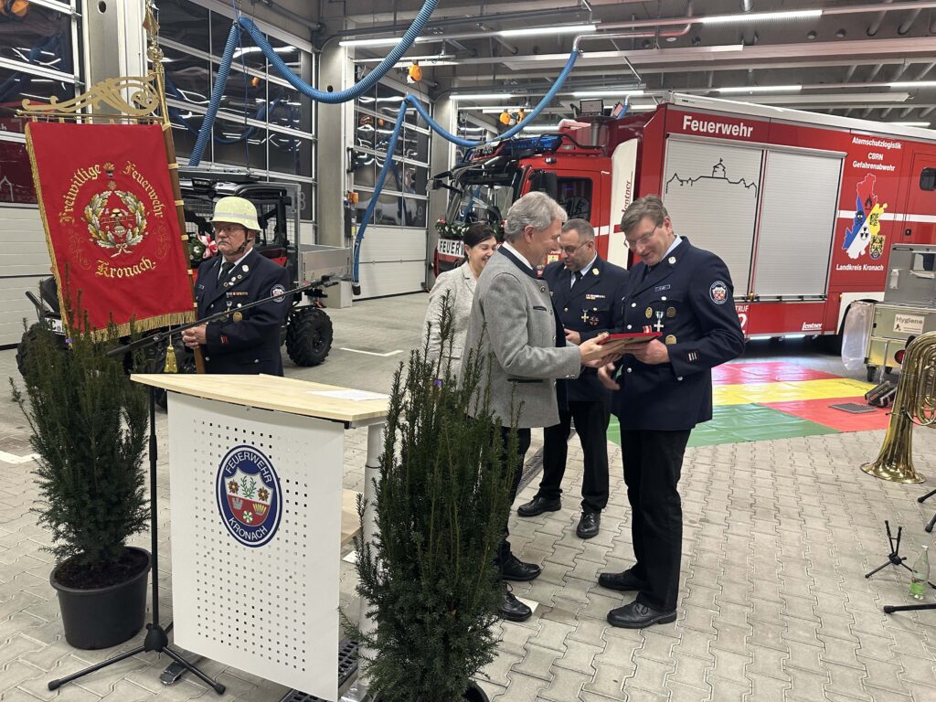 Lobende erwähnte er den Einsatz der Wehrleute, welche als Vorbild dienen und von denen es mehr bedürfe. „Anstelle nur zu fordern, sollten sich mehr ehrenamtlich in die Gesellschaft einbringen“, sagte er unter den Beifall der vielen Wehrleute. Für die leitungsstarken Wehren sei es heute üblich auch in der „Nachbarschaft“ und bei Großschadensereignissen über Ländergrenzen hinweg zu helfen. Der Freistaat wisse dies zu schätzen und werde die Kommunen auch weiterhin unterstützen, zumal die Preise für diese Gerätschaften auch gestiegen sind. Von einem ganz besonderen Tag für den Landkreis Kronach sprach Landrat Klaus Löffler. Der landkreiseigene Gerätewagen Atem- und Strahlenschutz (GWAS) ist bereits seit Monaten im Einsatz und wird jetzt offiziell in Kronach stationiert. Beim Brandeinsatz des WBV Gebäudes in Rothenkirchen hatte das Fahrzeug auch schon seinen ersten Einsatz. Die Gesamtkosten betrugen 546.000 Euro, Fördermittel gab es in Höhe von 115.000 Euro vom Freistaat. Als weiteres Fahrzeug wurde ein UTV, ein geländegängiges Kleinfahrzeug, übergeben. Es findet wie der GWAS seinen idealen Platz im Feuerwehrzentrum Kronach. Im Katastropheneinsatz wird die Betreuung von der Wehr aus Dörfles zusammen mit dem bei ihnen stationierten Mannschaftstransportfahrzeugs übernommen. Namentlich hob er Christian Lieb und Matthias Bauer hervor, welche die Ausschreibung und den Beschaffungsprozess begleitet haben. Beide haben viel Herzblut und Fachwissen eingebracht und sind auch für die Schulungen des Bedienpersonals verantwortlich. Das persönliche Erscheinen des Ministers Joachim Hermann bezeichnete er als starkes Zeichen und Wertschätzung gegenüber den Feuerwehren und dem Ehrenamt. Den kirchlichen Segen spendeten Dekanin Ulrike Schorn und Stadtpfarrer Albert Müller. Beide waren von der „faszinierenten Sache“ und dem Dienst an der Gemeinde angetan. Von einer guten Grundlage für die Sicherheit sprach Bürgermeisterin Angela Hofmann in ihrem Grußwort. Als klares Bekenntnis zum Schutz der Landkreisbevölkerung bezeichnete Kreisbrandrat Frank Fischer die beiden Anschaffungen. Sein Dank galt dem Kreistag mit Landrat Klaus Löffler an der Spitze, welche die finanziellen Mittel langfristig eingeplant hatten. Am Ende des Festaktes wurde Gerwin Lieb für 40-jährige aktive Mitgliedschaft in der Kronacher Wehr mit dem staatlichen Ehrenzeichen in Gold ausgezeichnet. Der aktive Pohl der Wehr ist Zugführer und bringt sich im Verein als Schriftführer ein.