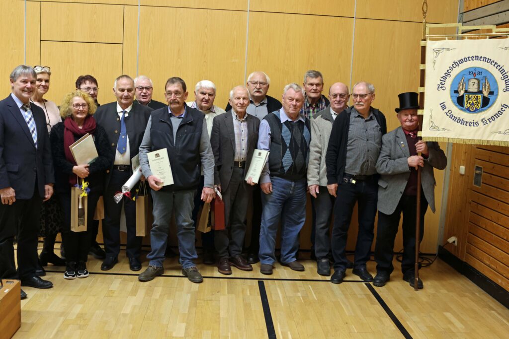 Ehrungen langjähriger Mitglieder der Feldgeschworenen und die Ernennung von zwei Ehrenmitgliedern standen bei der Mitgliederversammlung in der Kronachtalhalle in Steinberg an. Mit im Bild die Ehrengäste und Standartenträger Georg Ziegler (rechts). Foto: Michael Wunder