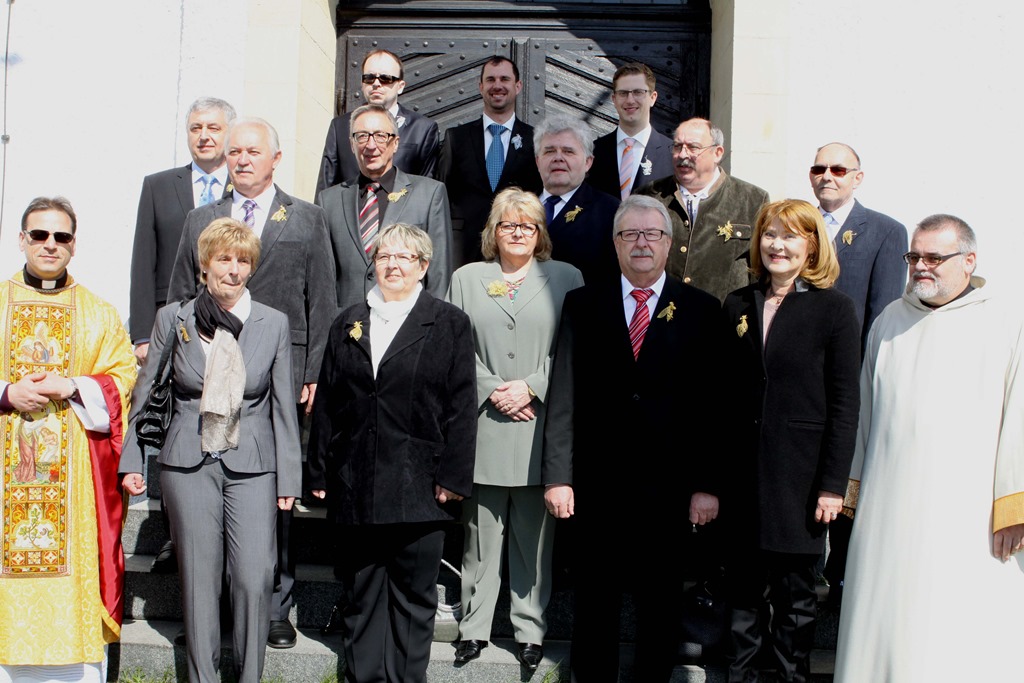 Vor 50 bzw. 25 Jahren gingen diese Frauen und Männer erstmals zum Tisch des Herrn.Mit im Bild Pfarrer Richard F. Reis (links) und Pastoralreferent Harald Ulbrich. Foto: Michael Wunder