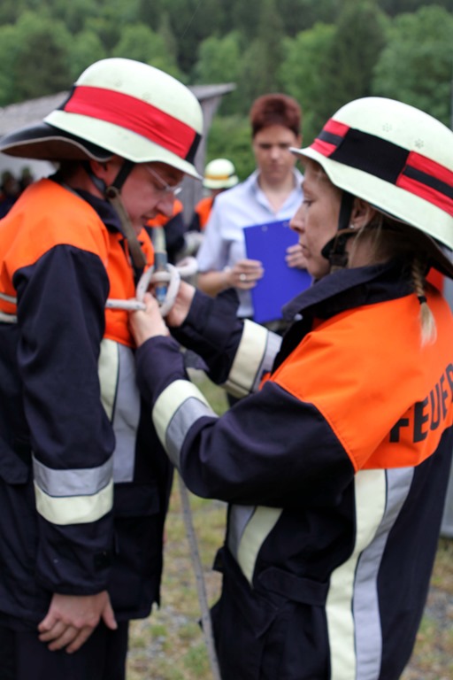 Die Schiedsrichter um Kreisbrandinspektor Hans-Ulrich Müller konnten sich dabei von der Leistungsfähigkeit der Wehr überzeugen. Bei leichtem Regenwetter wurden die Aufgaben mit Bravour erledigt. Dabei erreichte Claudia Blinzler die Endstufe 6. „Ich war als Gründungsmitglied der Damengruppe bei allen Leistungsprüfungen durchgehend dabei“, meinte die Frau des Kommandanten. „Mir macht die Feuerwehraufgabe, auch wenn es manchmal beruflich schwer zu koordinieren ist, richtig Spaß. Deshalb werde ich auch jetzt, nachdem ich alle Abzeichen erreicht habe nicht aufhören, sondern weiter als Wiederholer zur Verfügung stehen. Nur durch regelmäßiges Üben kann die Aufregung gelegt und professionelle Hilfe geleistet werden“, so Claudia Blinzler. Sie erhielt für ihre lautstarken und eindeutigen Befehle ein Sonderlob von den Schiedsrichtern. „Es geht hier um mehr als nur einen Eimer umzuspritzen“, sagte Hans-Ulrich Müller im Namen der Schiedsrichter Martin Panzer, Markus Reischel und Nadine Hempfling. Nur durch ständiges üben sei gewährleistet, dass im Ernstfall alle Handgriffe sitzen, so Müller. Im Namen der Stadt gratulierten 3. Bürgermeister Markus Wich und Stadträtin Carin Bülling zur bestandenen Leistungsprüfung. Sie dankten den Frauen und Männern, dass sie sich erneut der Herausforderung gestellt haben. mw