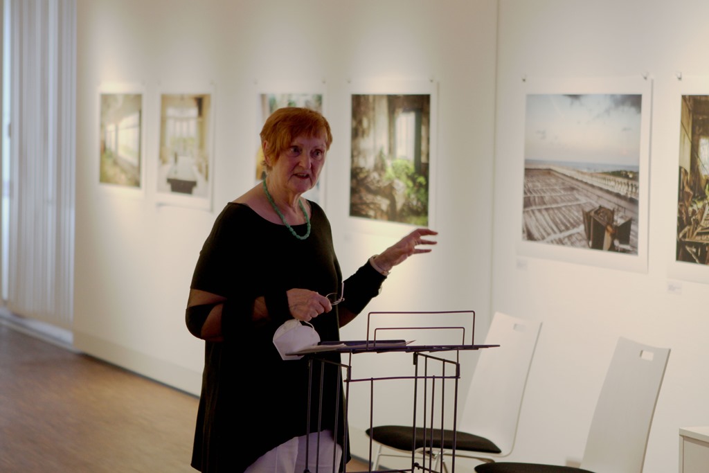 Irmgard Kramer gab bei der Vernissage Erläuterungen zu den Werken der einzelnen Künstler. Im Hintergrund die Ausstellungsstücke von Jürgen Schabel. Foto: Michael Wunder