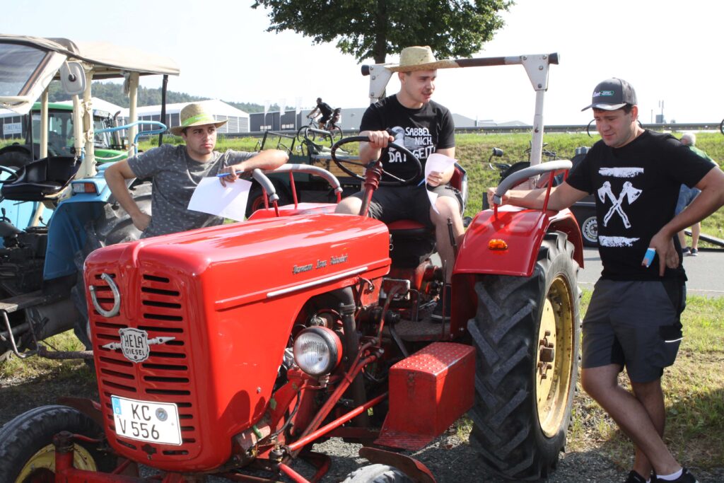Junge Männer fachsimpeln nach ihrer Ankunft in Schmölz über ihre alten Traktoren. Foto: Michael Wunder