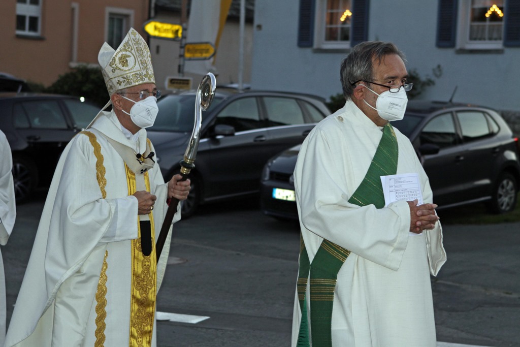 Erzbischof Ludwig Schick war der Festprediger bei der 76. Friedenswallfahrt. Er zog vor dem Gottesdienst mit weiteren Geistlichen um den Dorfplatz. Foto: Michael Wunder