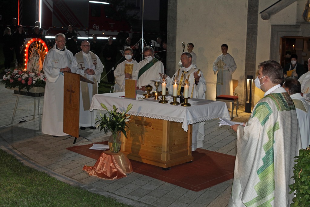 Vor dem Gotteshaus in Neuengrün war der Altar aufgebaut, Erzbischof Ludwig Schick war der Festprediger und feierte mit mehreren Geistlichen die Eucharistie. Foto: Michael Wunder