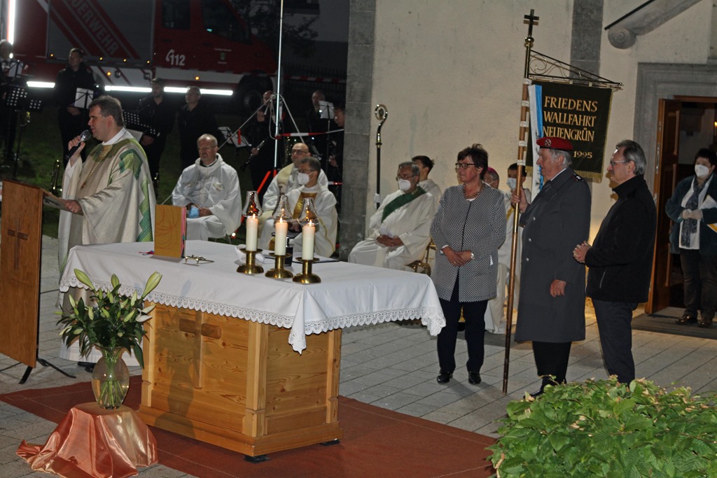 Nur wo Menschen aus christlichem Geist handeln, auf Rache und Vergeltung verzichten sowie auf Versöhnung setzten, könne wirklicher Friede entstehen, sagte Erzbischof Ludwig Schick bei der Friedenswallfahrt in Neuengrün. Man müsse gerade bei der Versöhnung auch mal bereit sein den ersten Schritt zu tun. Als Kinder Gottes sollte man alles für die Versöhnung tun, dabei Gleich und Gleichwertig beachten. Es sei Aufgabe jedes Gläubigen, sich für die Weitergabe des christlichen Glaubens und der Werte des Evangeliums einzusetzen. Die Friedenswallfahrt bietet immer wieder eine gute Gelegenheit den Dank nach außen zu tragen. Es sei ein besonderes Geschenk seit 76 Jahren in Frieden und Freiheit zu leben. Dazu kommt noch die Wiedervereinigung, welche ohne kriegerische Auseinandersetzungen vonstattenging. Nach dem zweiten Weltkrieg haben im Jahr 1945 Politiker wie Adenauer, De Gaspari oder Robert Schuman die Basis für den Frieden gelegt. Heute könne jeder einzelne in seinem Umfeld, vom Kindergarten, Schule am Arbeitsplatz oder in der Freizeit was für den Frieden tun. Man könne Beten, dass Gott die Menschen zu Werkzeugen seines Friedens macht. Bei all dem Tun, sollte man auch an die Vorfahren denken, welche unmittelbar nach dem Krieg vor mittlerweile 76. Jahren die Initiative ergriffen haben und die Friedenswallfahrt alle Jahre durchgeführt haben. Es sei eine gute Tradition an die Quelle des Friedens zu erinnern.Der örtliche Pater Jan Poja sah es als Ehre an, dass Bischof Ludwig Schick in die kleine Kirchengemeinde gekommen sei. Neuengrün sei der Ort der Gebetsbegegnung, auch wenn man heuer wieder auf die eigentliche Wallfahrt und die Betstunden verzichten musste. Wie im Vorjahr feierte man nach dem Einzug der Mitwirkenden unter Einhaltung der geltenden Richtlinien eine gemeinsame Eucharistie vor dem Gottesdienst. Im Anschluss wurde die Friedensstandarte wurde vom katholischen Seelsorgebereich Frankenwald, hierbei war die Pfarrei Teuschnitz federführend, an den katholischen Seelsorgebereich Kronach übergeben. Der Gottesdienst wurde vom Musikverein Neuengrün/Schlegelshaid mitgestaltet.