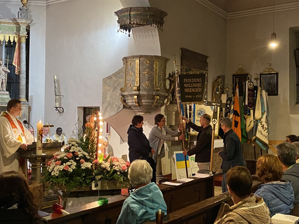 Die Friedensstandarte wurde vom katholischen Seelsorgebereich Kronach an Seelsorgebereich Frankenwald übergeben. Foto: Harald Ulbrich