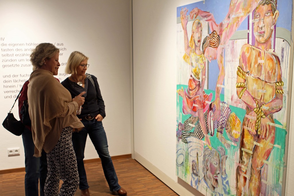 Bei der Vernissage für die Ausstellung „Eros in Bedrängnis“ war die Kulturamtsleiterin der Stadt Schweinfurt Andrea Brandl als Laudatorin angereist. Wie sie vor den zahlreichen Besuchern sagte, liegen die künstlerischen Ausdrucksformen seit Menschengedenken im Spannungsfeld von Landschaft, Stillleben und Menschenbild. Zwar haben sich in den vergangenen Jahrtausenden die Mittel und Materialien grundlegend geändert, aber der Mensch, eingebettet in seine Umgebung im Diskurs von innerer und äußerer Welt, bleibt das vorherrschende Thema im Fokus Bildender Kunst. Weiter sagte sie in ihrer beeindruckenden Rede, zwischen dem was man als Kunstwerk entstehen sieht, und dem, was viele von der Kunst erwarten, besteht eine Kluft. Zeitweise hat man geglaubt, dieses Nichtverstehen sei bedingt durch politische Umstände und Einflüsse. Nach vielen Erfahrungen können wir aber heute sagen, dass es Unbehagen ist, ein charakteristischer Zustand unserer heutigen Zeit. Sie erinnerte, dass Kronach wie Schweinfurt bis 1989 im Schatten der Grenze lagen und man deshalb seit Jahrzehnten dem Ost-West-Dialog der Leipziger Schule und ihren prominenten Realisten bevorzugt. Die Künstlerin Linde Unrein hat eine tiefe verwurzelte Liebe zu Italien und der Macht der Schönheit. Wer sich auf den Bilderkosmos der Fachärztin einlässt, wird auf den ersten Blick von heiterfarbigen Figuren eingenommen, die, zum Teil frei von jeder Form der realen Perspektive entbunden, im Bildraum springen, tanzen, laufen, stürzen und nicht unbedingt untereinander kommunizieren. Die Malerin gestaltet ihre Bilder aus einem Ausschnitt heraus, aus einer einzelnen Figur, aus der sich das Geschehen auf verschiedenen Ebenen der Wahrnehmung und erst im Prozess des Malers ergibt. Es ist ein Raum, in dem alles möglich ist, sagt sie, der aber auch deshalb ein „falscher“ Raum sein kann. Linde Unrein versteht ihre Werke als Einladung auf Spaziergänge für das Auge. Als versierte Wissenschaftlerin und mit einer besonderen Affinität zur Philosophie weiß sie um die Phänomenologie und Maurice Merleau-Pontys Erkenntnis, dass „das Auge das Fenster der Seele“ sei. Eingangs hatte die Vorsitzende Sabine Raithel die Gäste begrüßt und auf die bevorstehenden Termine hingewiesen (siehe Info Box). Die Vernissage wurde von Bernd Schelhorn und Linda Müller mit der Gitarre musikalisch mitgestaltet.
